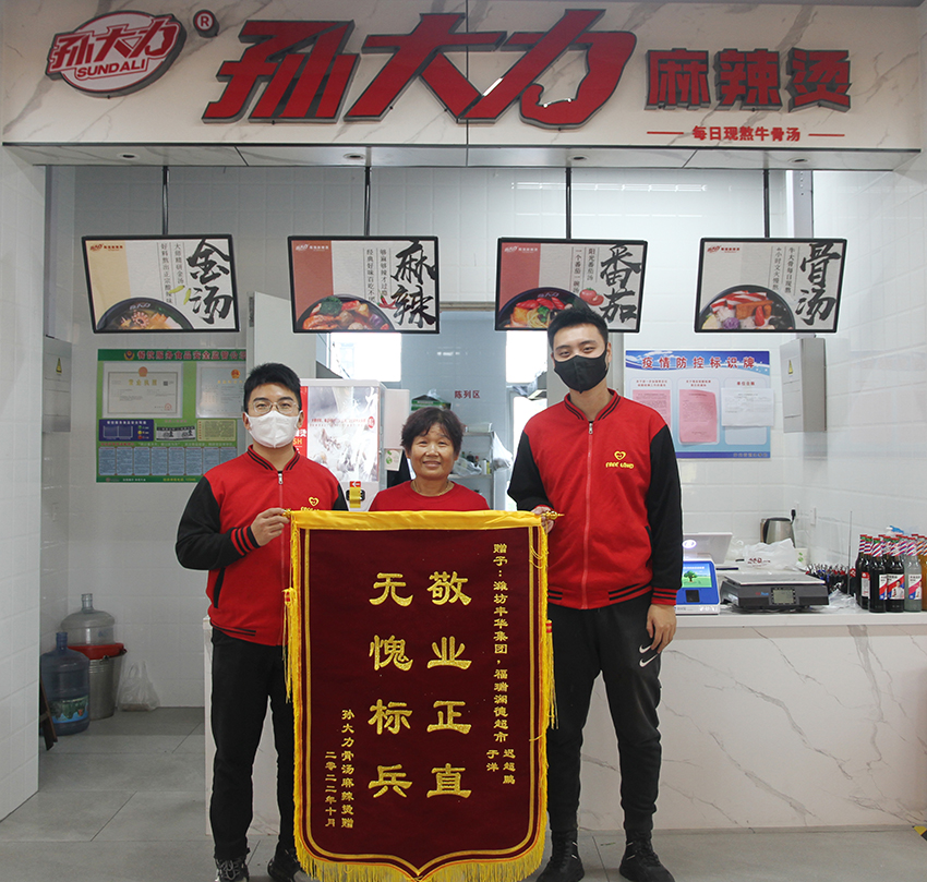 一心一意做服務,細節之中見初心。10月27日,二樓商戶孫大力骨湯麻辣燙老板手指受傷無法到店,僅剩兩位老人在店經營,因年紀大不會使用收銀系統,無法收款。于洋和遲超鵬得知該情況后主動擔當每天中午幫商戶收款,使其能夠正常經營。11月2日,二樓商戶孫大力骨湯麻辣燙為Free Land送來了錦旗。一是對此事表示感謝,二是對Free Land主動幫助商戶送餐、充電充水、有問題及時對接解決等日常服務工作表示肯定。截至發稿日期,Free Land仍在堅持每日中午幫助該業戶收款,真正將全心全意服務的宗旨和初心做到了實處。
