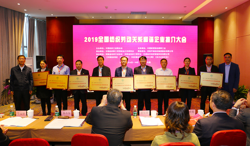 10月16日,由中國紡織工業聯合會主辦,中國財貿輕紡煙草工會支持,中國紡織職工思想政治工作研究會承辦的2019全國紡織勞動關系和諧企業推介大會在河南省許昌市舉行。根據大會評選,我公司榮獲“2019全國紡織勞動關系和諧企業”稱號。