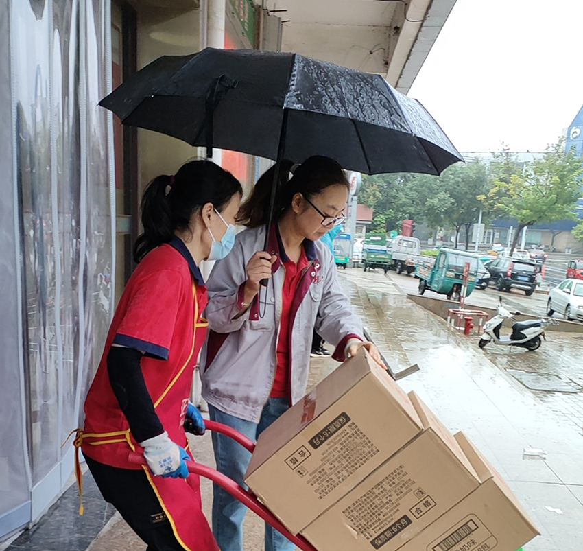 10月18日,民生店同事齊心協(xié)力、冒雨奮戰(zhàn),確保商品未濕損的同時迅速卸貨,以便后續(xù)團購業(yè)務(wù)及時配送。